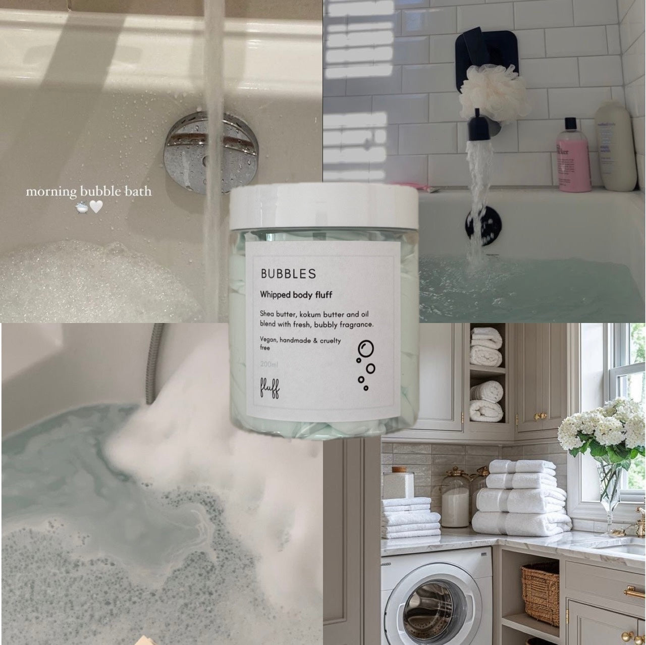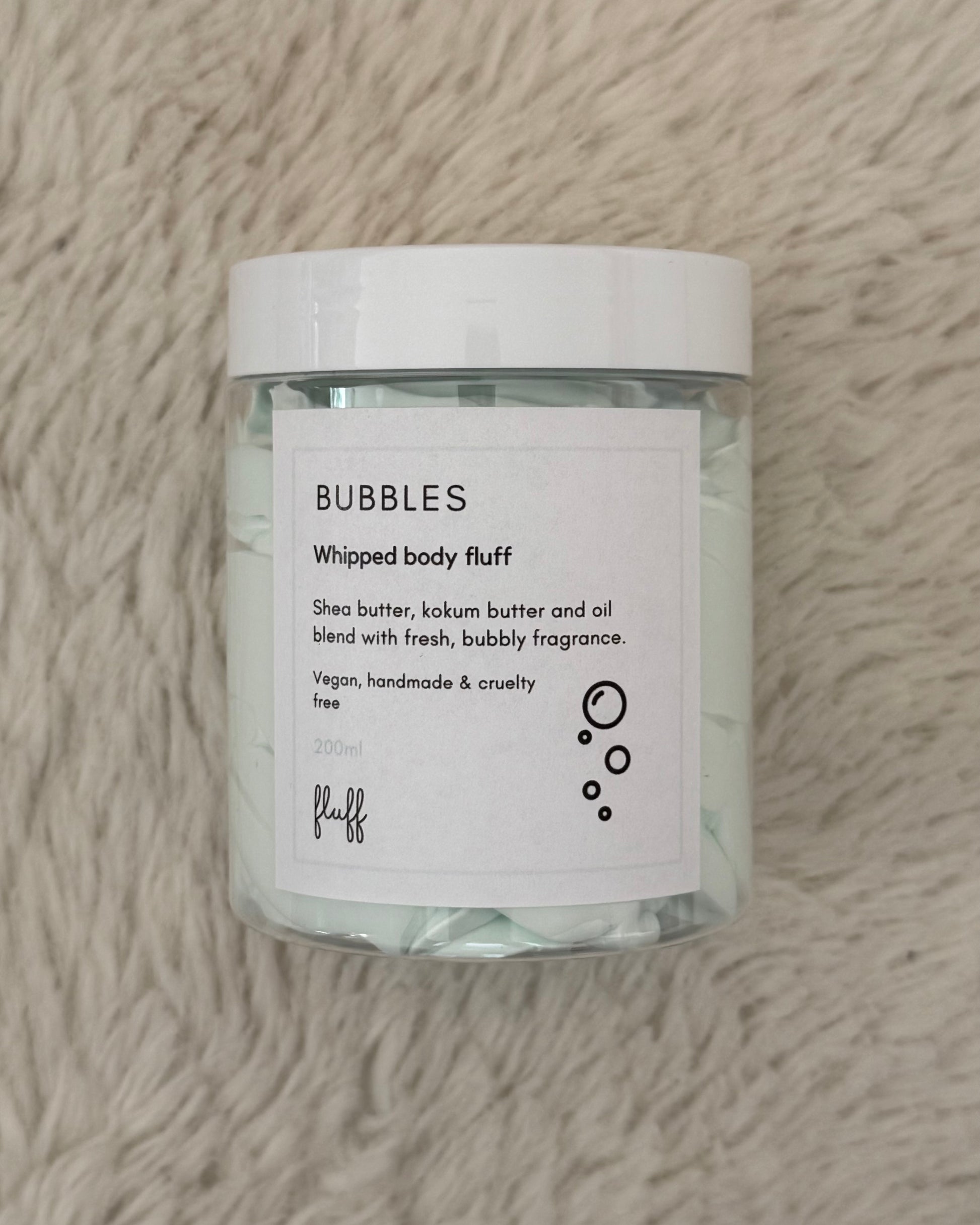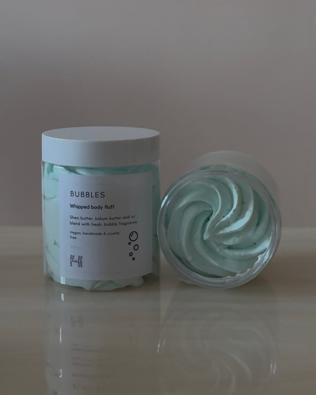 Our Bubbles Whipped Body Fluff is scented with fresh, bubbly fragrance and has a light blue colour just like real suds🫧